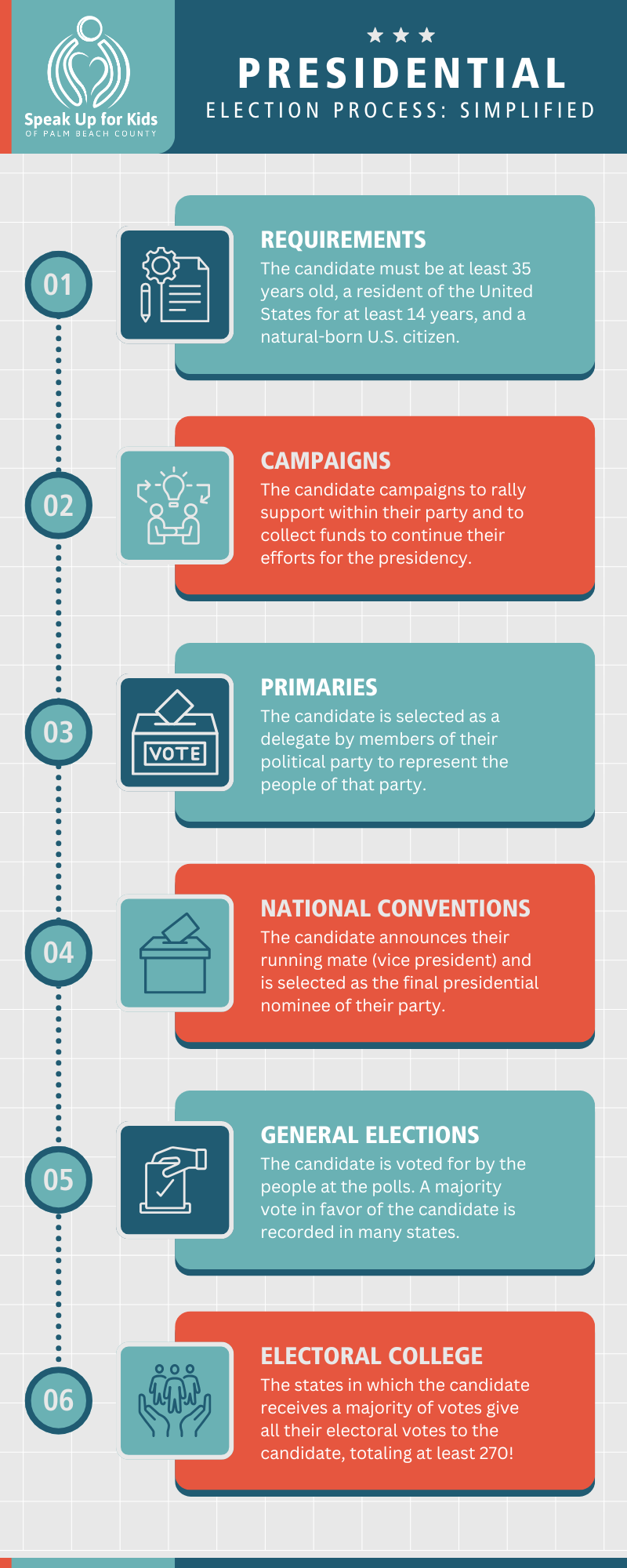 But the Electoral College only represents the final step in the process for presidential candidates. In reality, the election process is a whole lot longer, starting at least a year before the main election takes place. This article will briefly cover each of the steps to becoming president in case you ever want to give it a shot. (But seriously, it’s important to know this process as a citizen of the United States! And since you want to be informed before beginning to vote yourself once you turn 18).
