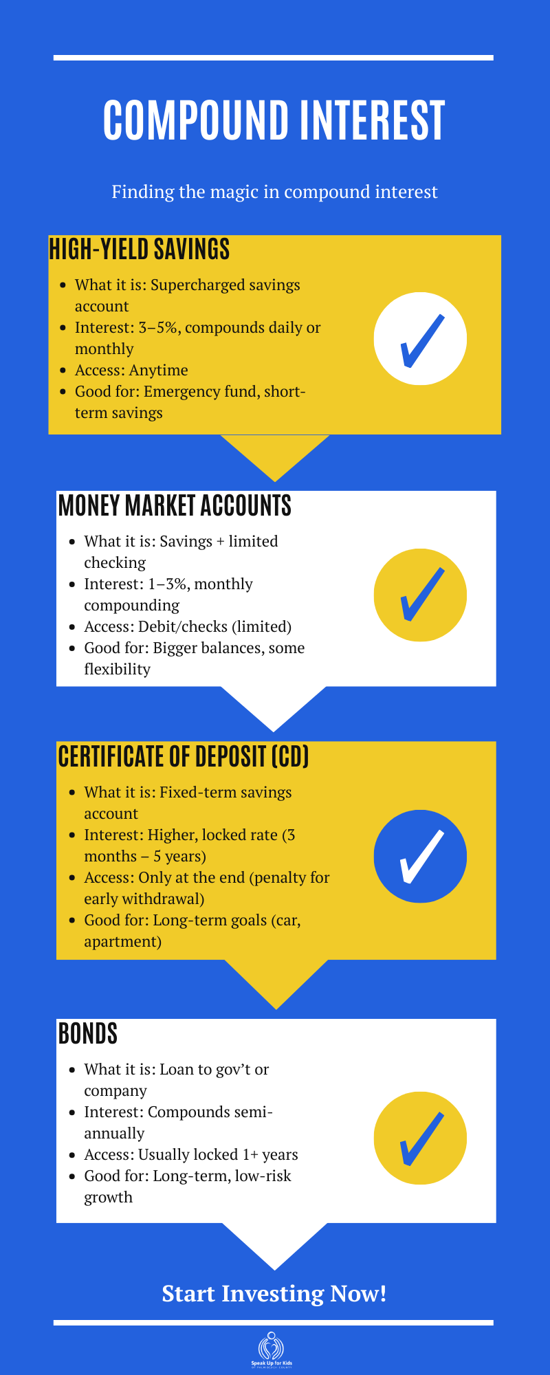 High-Yield Savings Accounts (HYSAs): A high-yield savings account (HYSA) works like a regular savings account but offers a higher interest rate. A HYSA offers a safe place to keep your money while earning a large amount of interest on it. These accounts are perfect for long-term savings and emergency funds. You can find a HYSA at banks such as Ally Bank, American Express, and Discover Bank.
