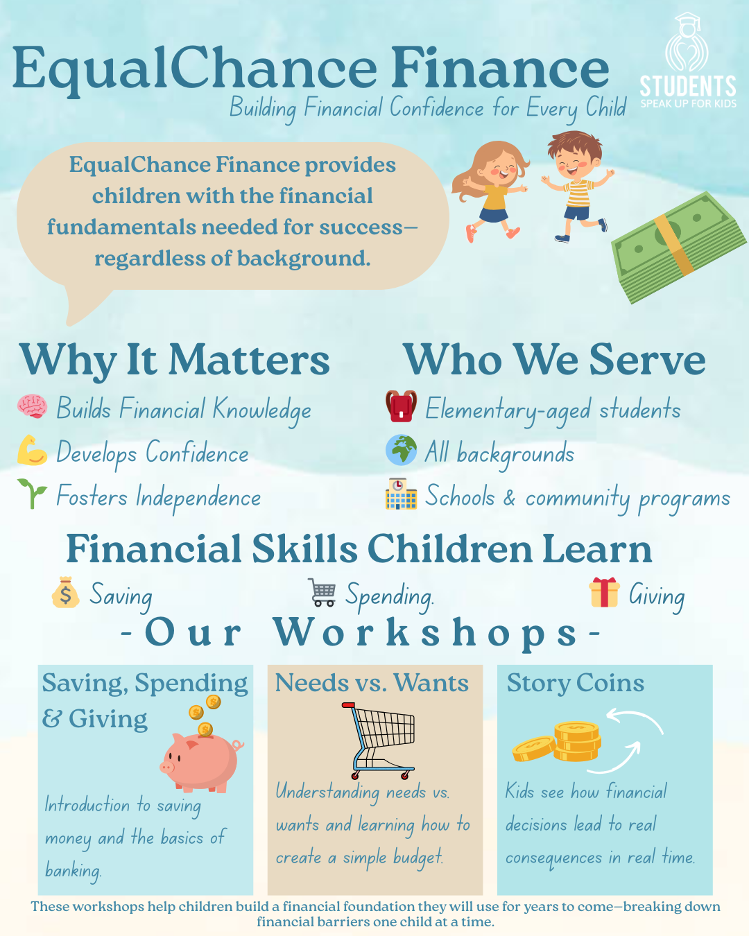 EqualChance Finance was created to provide children with the opportunity to learn the financial fundamentals necessary for success in today’s society. Regardless of background, EqualChance Finance offers a learning experience that enables kids to build a solid financial foundation, develop financial confidence, and foster independence. Through learn-by-doing workshops and interactive presentations, the younger generation is prepared for the future financial world. Driven by a passion for finance and a deep commitment to helping the next generation, EqualChance Finance works to break down financial barriers for all children.